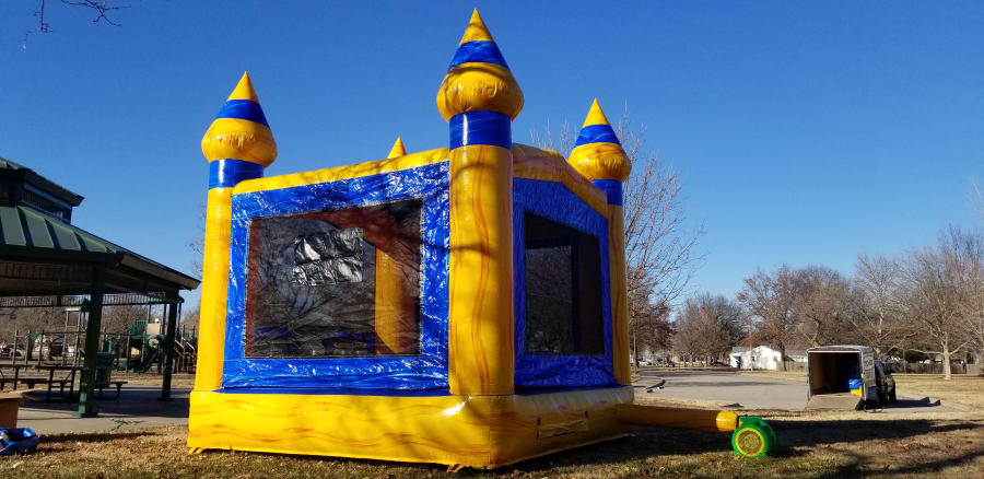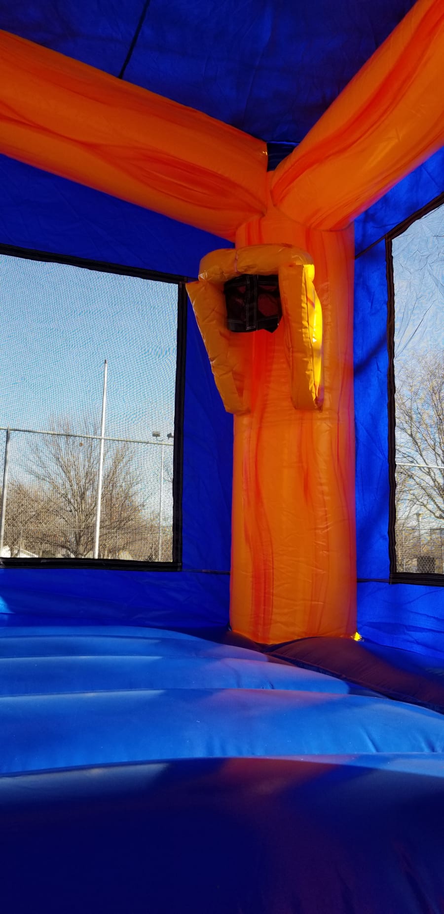 This bounce house includes a basketball hoop and large bouncing floor this inflatable unit is a desirable rental choice for any party. or event its yellow marble colors are bright and colorful and will bring joy for any children for hours of fun its yellow and blue marble color are spectacular for any celebration not to mention this unit has a 360 degree view netting for extra airflow which will allow the kids to stay nice a cool and at the same time safe