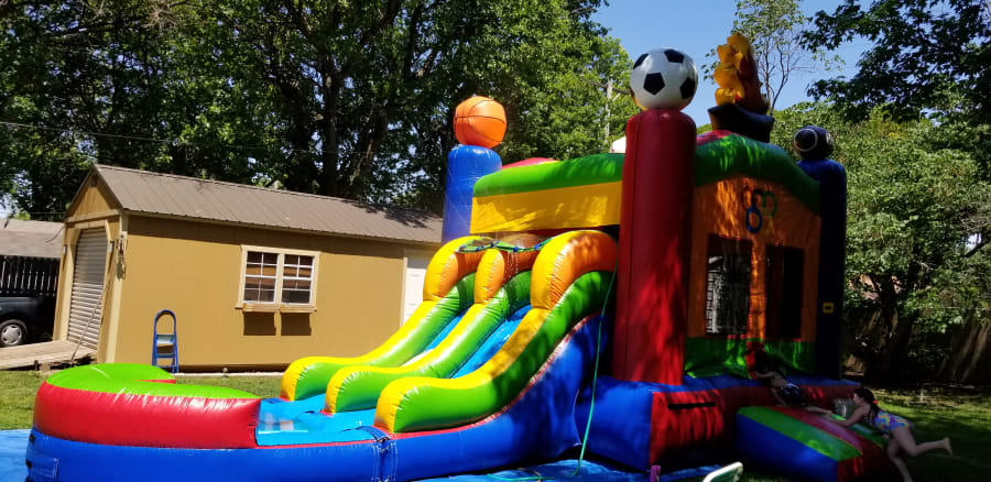 OLYMPIC COMBO This unit can be used wet or dry. This ultimate sports bounce house dual waterslide combo doubles the summer time fun for a splashing good time during those hot days! It features a jumping area with 2 exit slides and is a definite crowd pleaser during those cooler fall days.