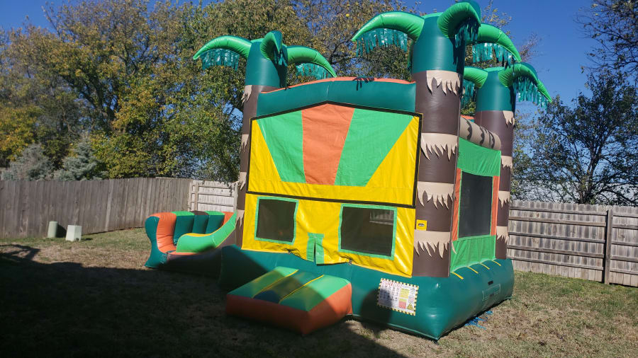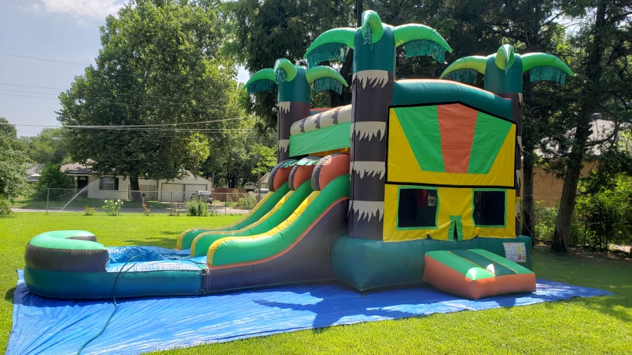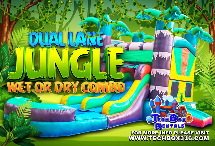 JUNGLE COMBO This unit can be used wet or dry. The jungle bounce house dual waterslide combo is a great unit to feature at outdoor events especially when you add water to the fun! It features a jumping area with 2 exit slides so bouncers can race each other!