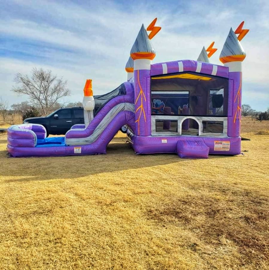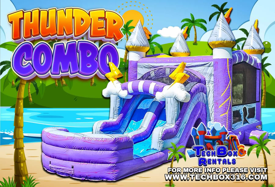 The Thunder Dual Lane Combo is a storm brewing with fun! Guests can enjoy a dual lane slide, bounce house, climb wall, basketball hoop, tunnel, and obstacles all on one inflatable! This array of features is a lightning rod for attention!