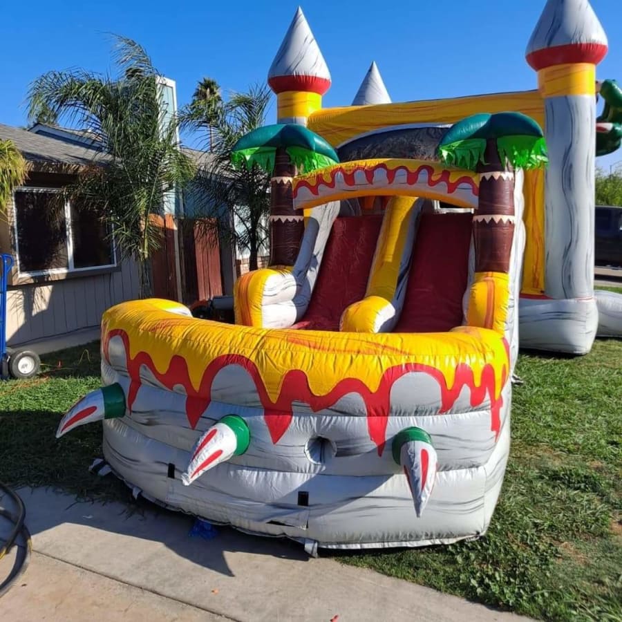 The T rex combo features a big jumping area for the kids obstacles inside and basketball hoop double slide and pool at the bottom foe those hot summer times its unique colors and claws make this unit really stand out
