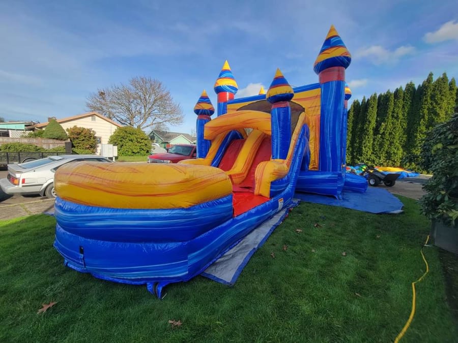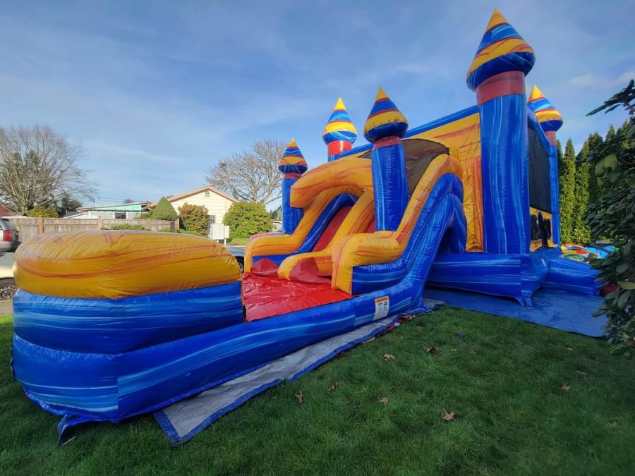 The Artic Dual Lane Combo is one cool inflatable! Its dual lane slide, bounce house, climb wall, and basketball hoop means it can easily keep kids entertained! This combo is an all season wet or dry use. It's bright colors makes this unit stand out and brings countless hours of fun for everyone at your Next Party or Event