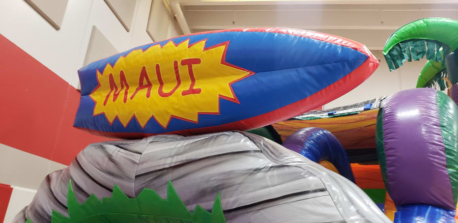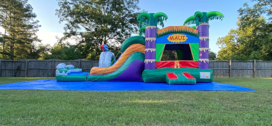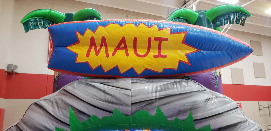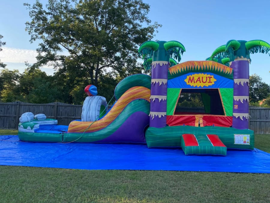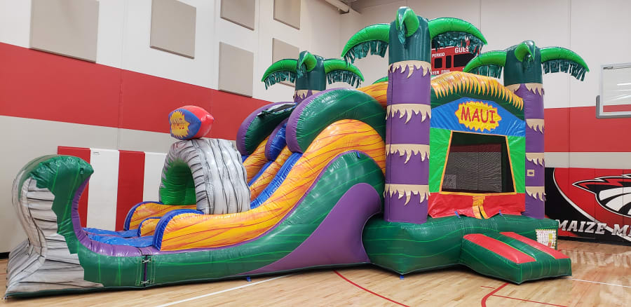 he Maui Dual Lane Combo is one cool inflatable! Its dual lane slide, bounce house, climb wall, and basketball hoop means it can easily keep kids entertained! This combo is an all season wet or dry use.
