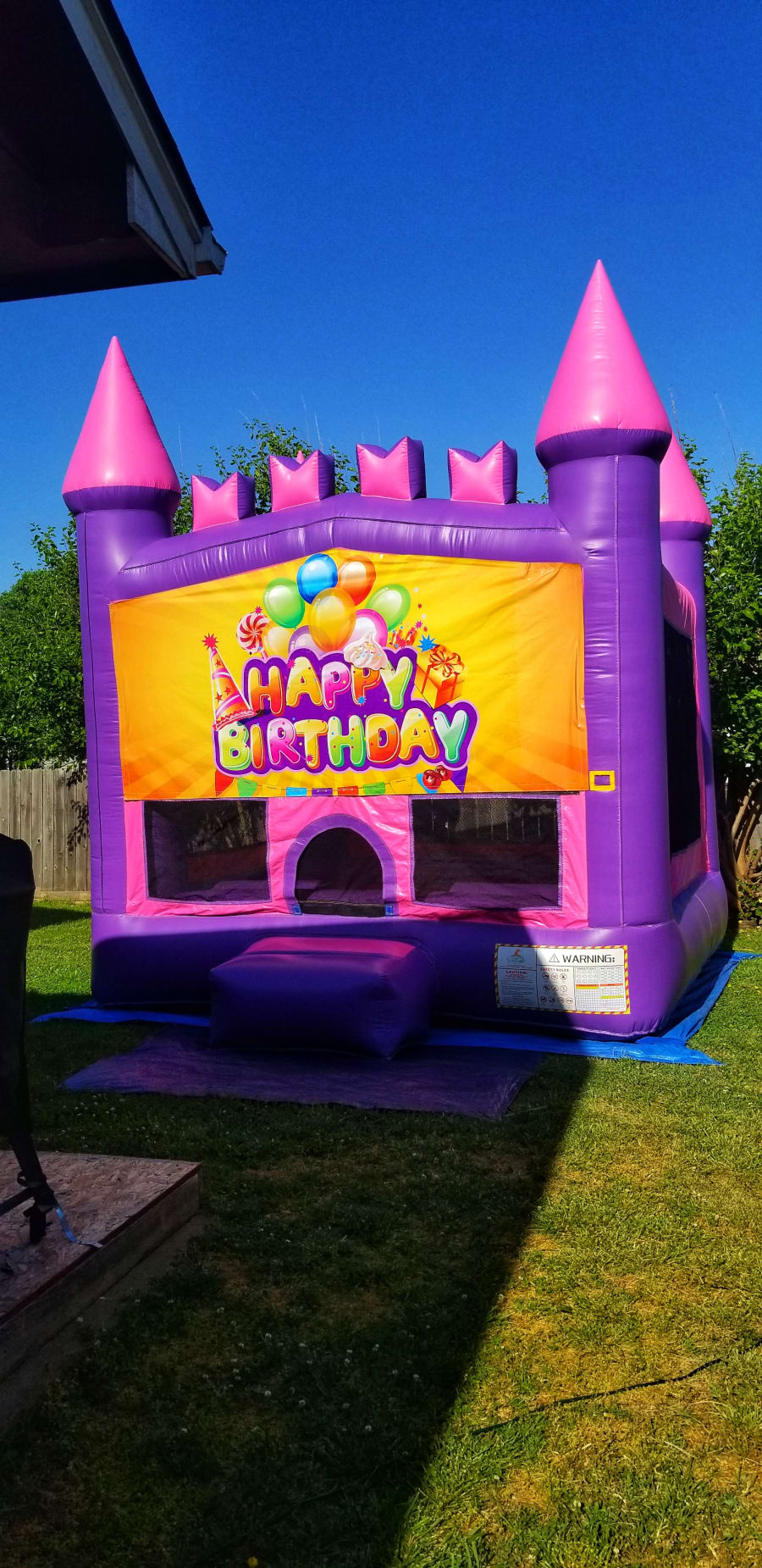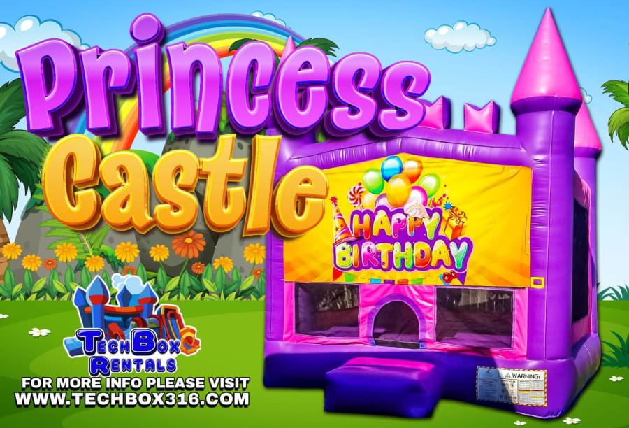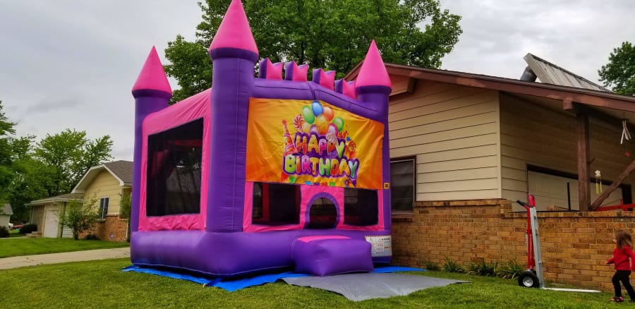 This unit features bright pink and purple colors with multiple banner options, for girls. This unique bouncy castle features 4 pillars on the top and also bricks in front to give it a more vivid castle look. Available banners to choose from include: Happy Birthday. No matter what the theme, this castle will bring hours of entertainment for all!