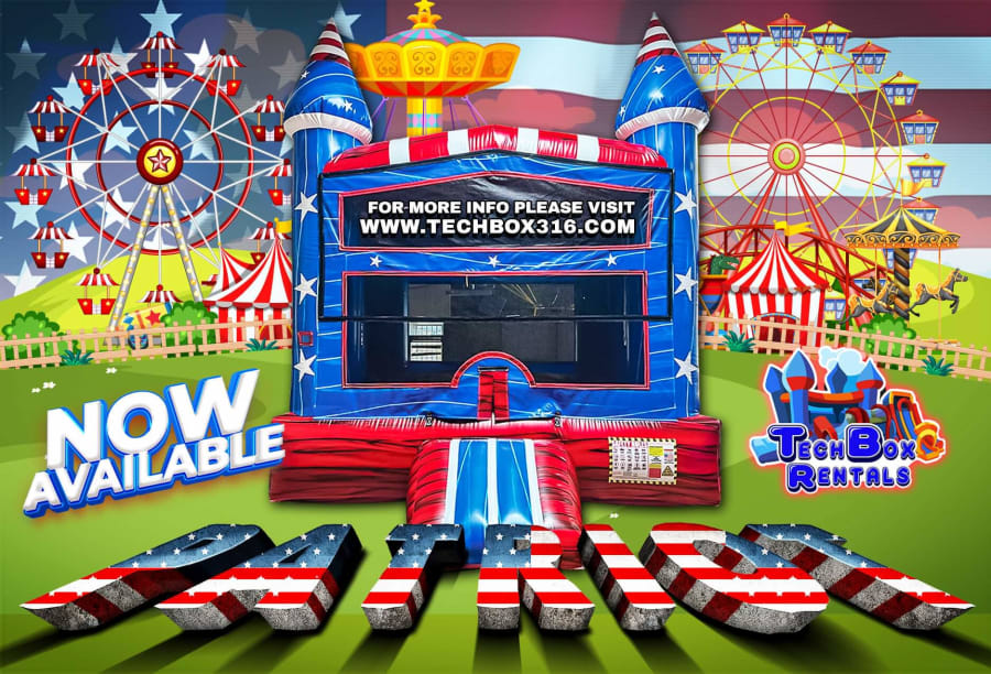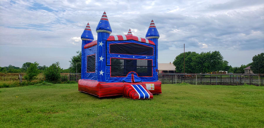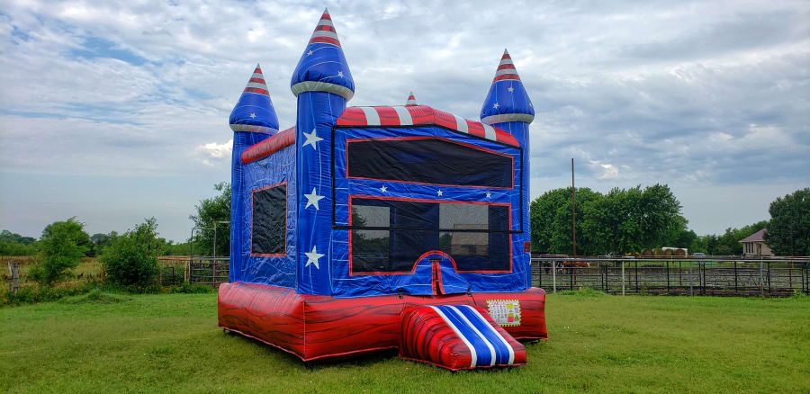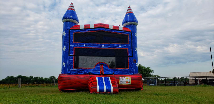 Let the party begin the patriot is here and ready to party its super bright colorful colors makes this unit stand out this 13x13 unit has a basketball hoop inside and its ready for any backyard or event this blue red with and stars all around this unit makes it super cool and fun for all kids and ages reserve now