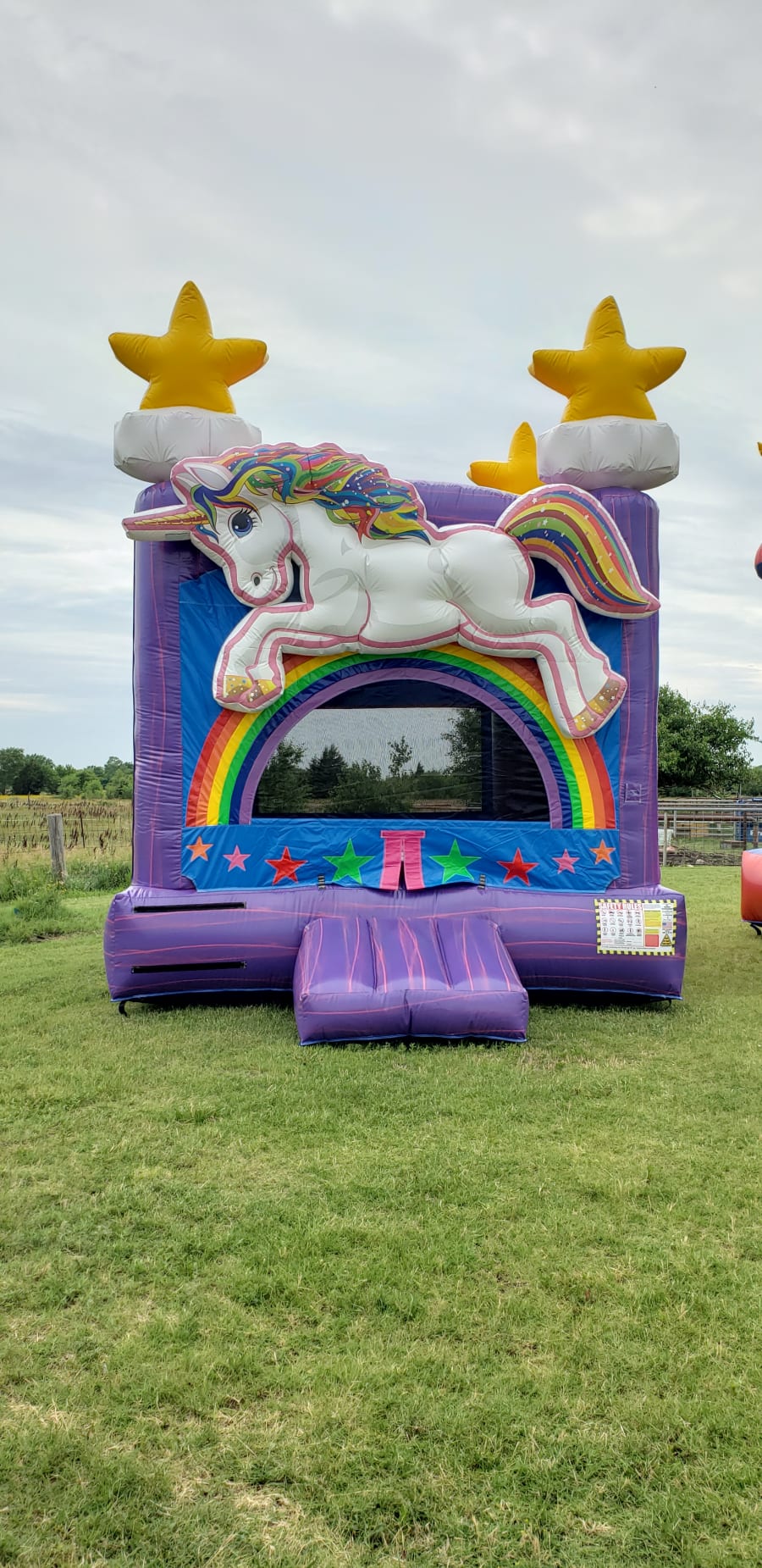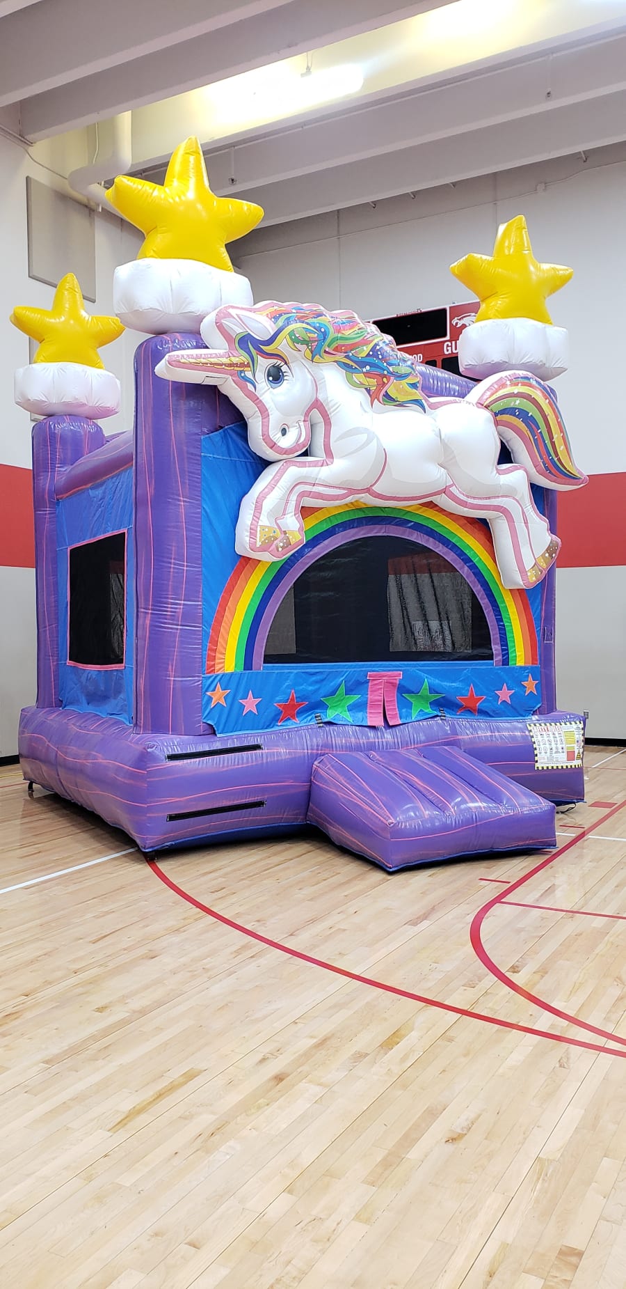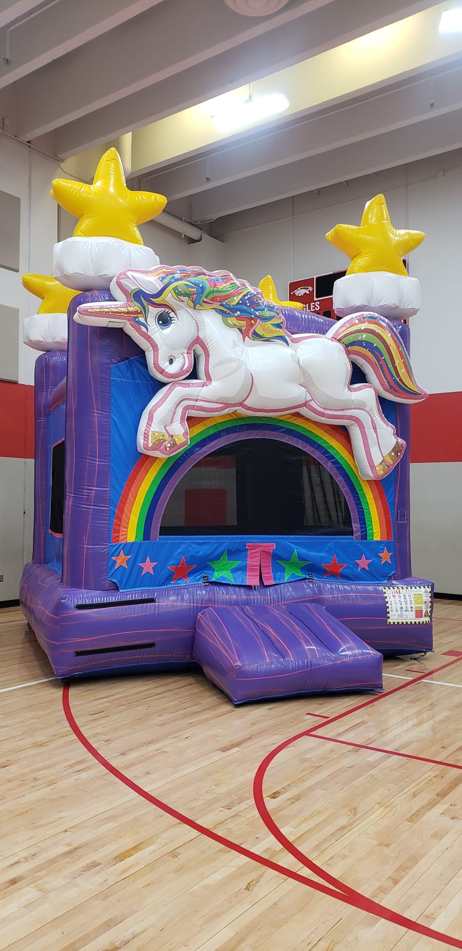 The exterior of the bounce house is decorated with vibrant and colorful images of unicorns, rainbows, stars, and other magical elements that create a sense of enchantment and wonder. The interior of the bounce house features a large, open space for jumping, bouncing, and playing.