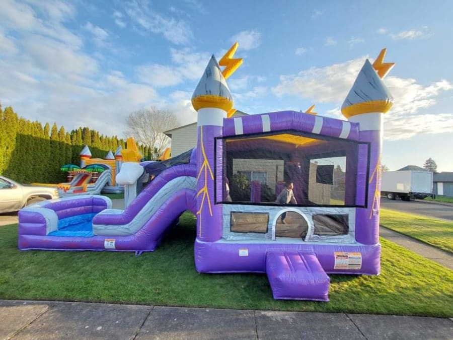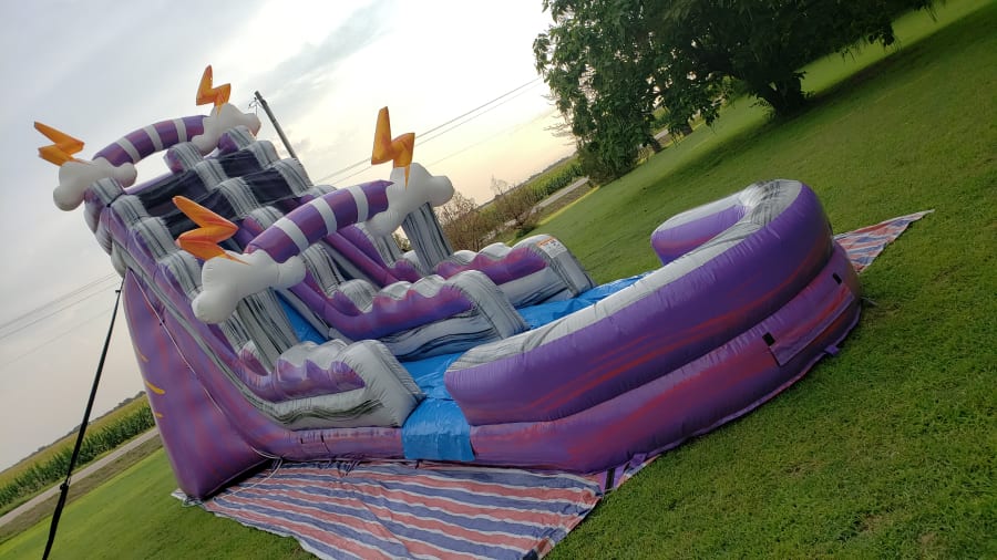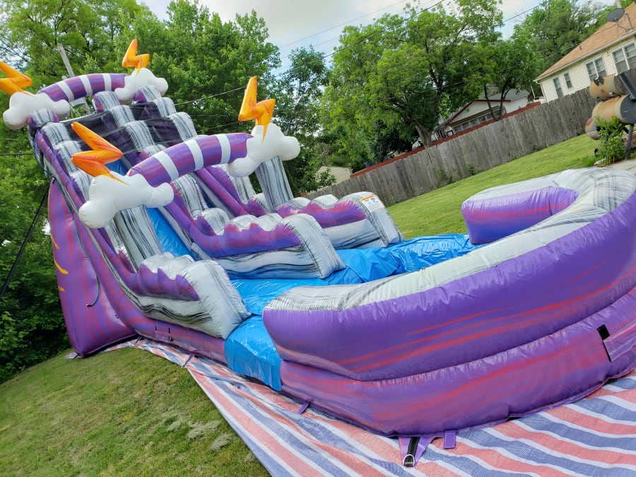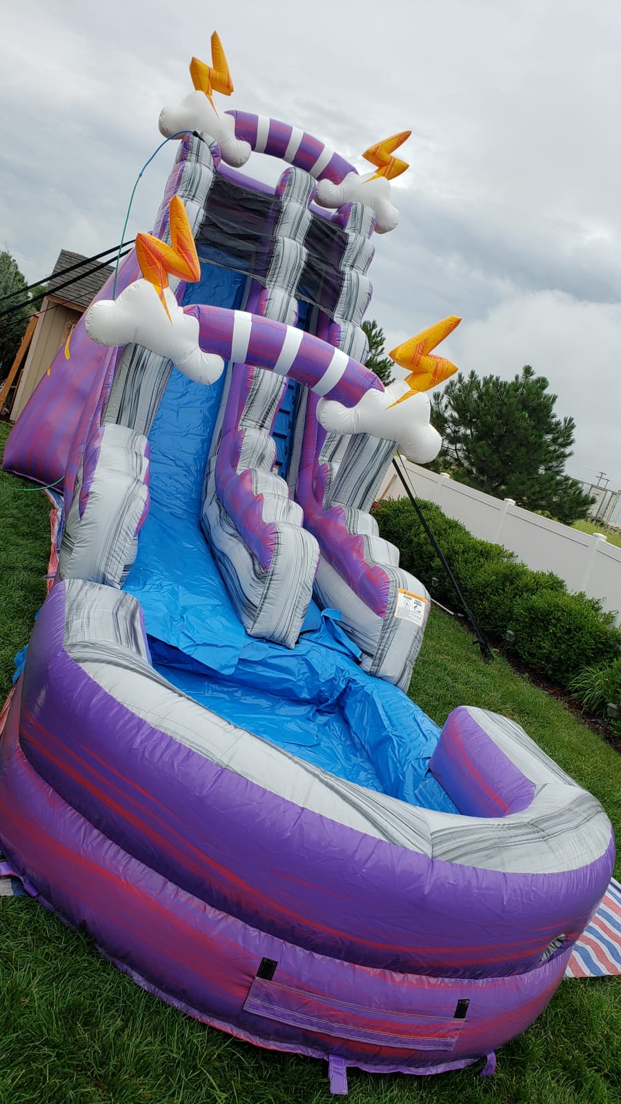 Thunder Waterslide is a thrill seekers dream . This unique unit has one of the steepest drops which will bring lots of fun and laughs with its unique colors purple white and grey marble colors and lighting feels like Zeus itself going to join in on the party this unit definitely stand out in any type of event it is a must for all ages