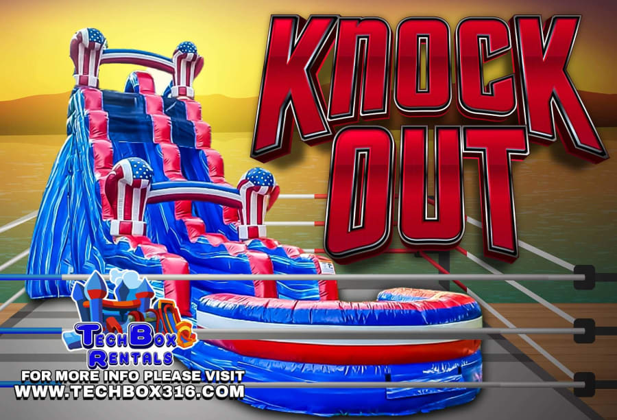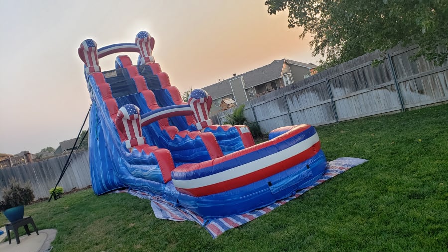 The 20ft American Boxer is a great addition to any party or event. It features a large drop and is sure to bring a lot of excitement to any event. Its sleek design and calming effect make it the ultimate water slide for everyone from big to small The bold Red, White, and Blue marble design on this huge inflatable water slide are always a big hit for any type of event